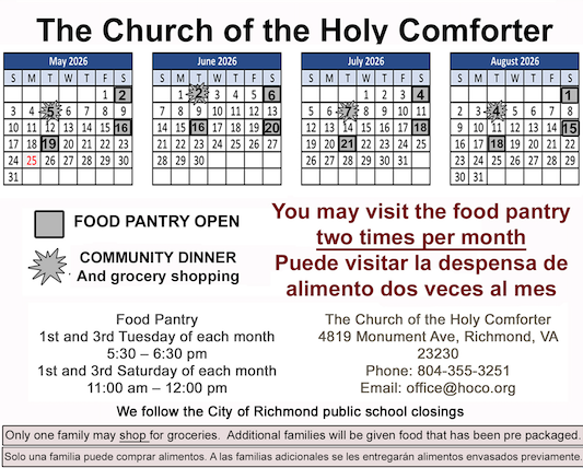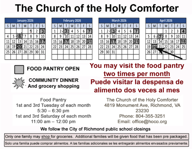2. Nos asociamos con ACTS (Congregaciones del Área Unidas en el Servicio) y podemos presentar una solicitud de asistencia en su nombre. Llame a la oficina parroquial al 804-355-3251 de lunes a jueves, de 10:00 a. m. a 1:00 p. m., para consultar sobre esto. En el Santo Consolador no podemos darle dinero en efectivo ni pagar facturas de vivienda, servicios públicos, teléfono, atención médica u otras facturas en su nombre.