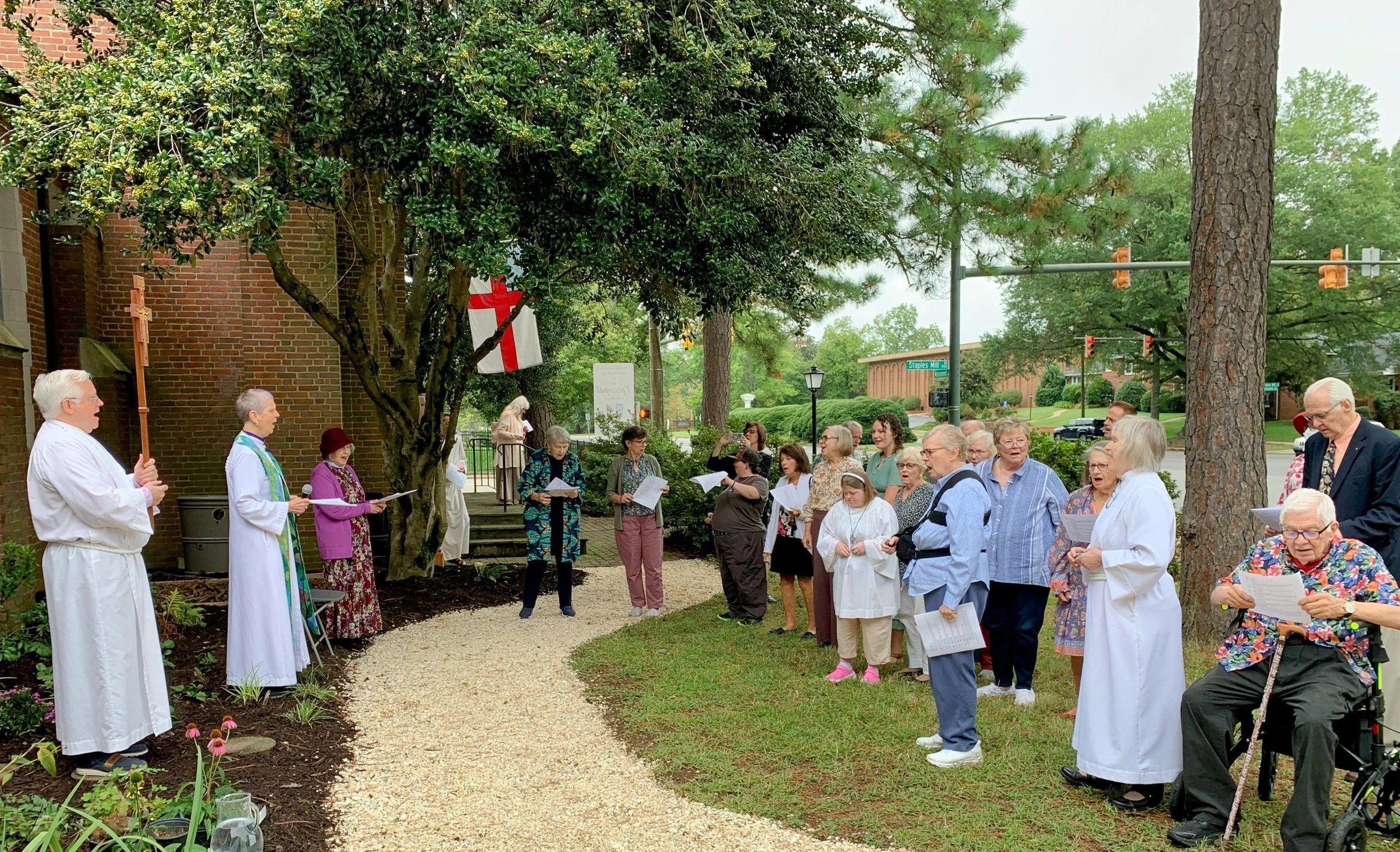 Welcome to the rain garden at the Church of the Holy Comforter! A year and a half in the planning, the idea began with the Rain Water Assessment done by the Alliance for the Chesapeake Bay, who also trained some of our members. After reviewing the assessment, the HoCo Eco committee recommended to Vestry that two of the rain spouts on the Monument side be directed into a 250 sq. ft. rain garden of native plants. Water shed from the roof enters the garden at two inlets, passes through layers of growth medium, sand, and gravel and then into subsoil. Overages are handled by an under-drain and outlet, accessible through two clean-outs. Two bay-scapes of native plants also capture rain water. These gardens serve several purposes. They prevent overflow into storm sewers, treat water by filtration, decrease lawn area, and provide native plants for bees. wasps, butterflies and other pollinators, decrease storm sewer tax, provide a information source about the church and creation care, and serve as a source of recycled plastic bags for dog-walkers. The natural setting is also a place for us and our neighbors to enjoy. Professional assistance in design came from Lorne Field, Kip Mumaw (EcoSystem Services), and Jacob Bauckman (Alliance for the Chesapeake Bay). Excavation of the site was done by F.I.R.S.T. Contractors, managed by Larry Lindsey. Read more about them in the HoCo Eco Newsletter 1.3. The information center was built by Jim Koren and painted by Emily Herr. Garden plants were provided by Martha Burford and the excavated site prepared by HoCo Volunteers on March 21, 2015.